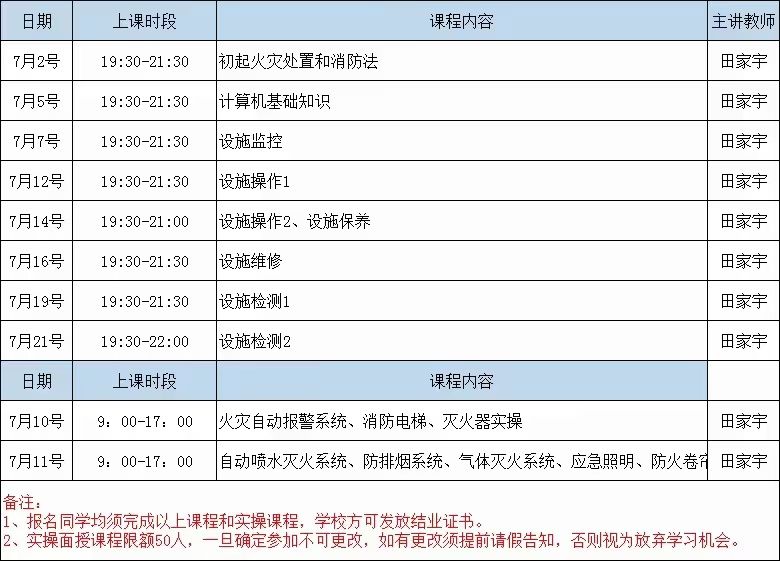 7月消防设施操作员培训课程安排如下: